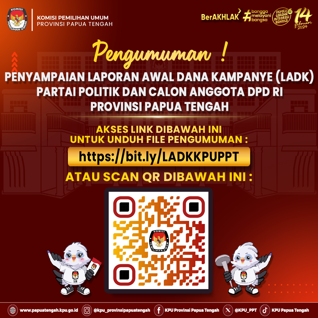 Berikut Kami Sampaikan Pengumuman Penerimaan Laporan Awal Dana Kampanye (LADK) Peserta Pemilu Tahun 2024. Mohon untuk dapat mengkases link berikut https://bit.ly/LADKKPUPPT atau dapat juga dengan Scan QR Barcode pada gambar.....