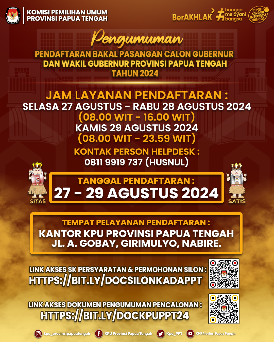 PENGUMUMAN PENDAFTARAN BAKAL PASANGAN CALON GUBERNUR & WAKIL GUBERNUR PROVINSI PAPUA TENGAH TAHUN 2024