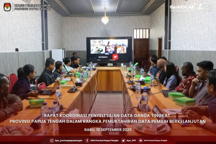 KPU Provinsi Papua Tengah melaksanakan Rapat Koordinasi Penyelesaian Data Ganda dalam rangka Pemutakhiran Data Pemilih Berkelanjutan pada Rabu (10/09/2025). Kegiatan ini berlangsung secara luring di Aula Kantor KPU Provinsi Papua Tengah dan daring melalui Zoom Meeting. Rapat dibuka oleh Ketua KPU Provinsi Papua Tengah bersama Anggota dan Plh. Sekretaris, serta diikuti oleh Anggota Divisi Data dan Informasi, Kasubbag Perencanaan, Data dan Informasi, serta Admin/Operator Sidalih KPU se-Provinsi Papua Tengah. Kegiatan ini bertujuan untuk memastikan keakuratan data pemilih sekaligus memperkuat sinergi antar-KPU Kabupaten dalam mendukung pemutakhiran data pemilih berkelanjutan. ....