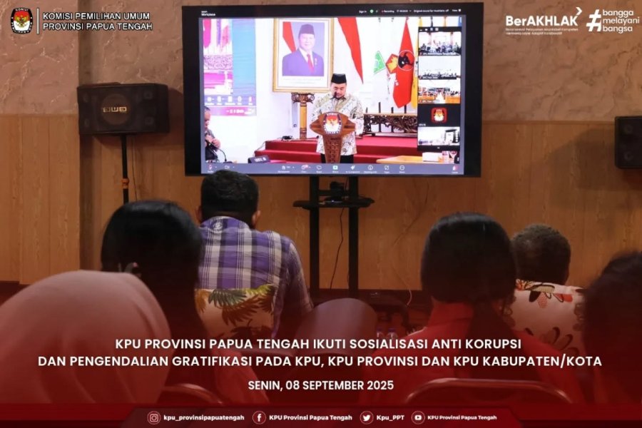 KPU Provinsi Papua Tengah mengikuti Sosialisasi Antikorupsi dan Pengendalian Gratifikasi yang dilaksanakan secara daring bersama KPU RI, KPU Provinsi, serta KPU Kabupaten/Kota pada Senin (08/09/2025). Kegiatan ini diikuti oleh Ketua, Anggota, dan jajaran Sekretariat KPU Provinsi Papua Tengah. Ketua KPU RI, Mochammad Afifuddin, dalam sambutannya mengapresiasi keberhasilan penyelenggaraan Pemilu dan Pilkada Serentak 2024. Beliau menegaskan bahwa dengan kewenangan besar yang dimiliki, setiap pegawai KPU wajib menjaga integritas dan meminimalisir potensi penyalahgunaan wewenang melalui sistem kerja yang transparan dan akuntabel. Kegiatan juga menghadirkan Deputi Bidang Pendidikan dan Peran Masyarakat KPK, Wawan Wardiana, sebagai narasumber. Melalui sosialisasi ini, KPU Provinsi Papua Tengah memperkuat komitmen untuk bekerja profesional, transparan, dan bebas dari praktik gratifikasi. ....