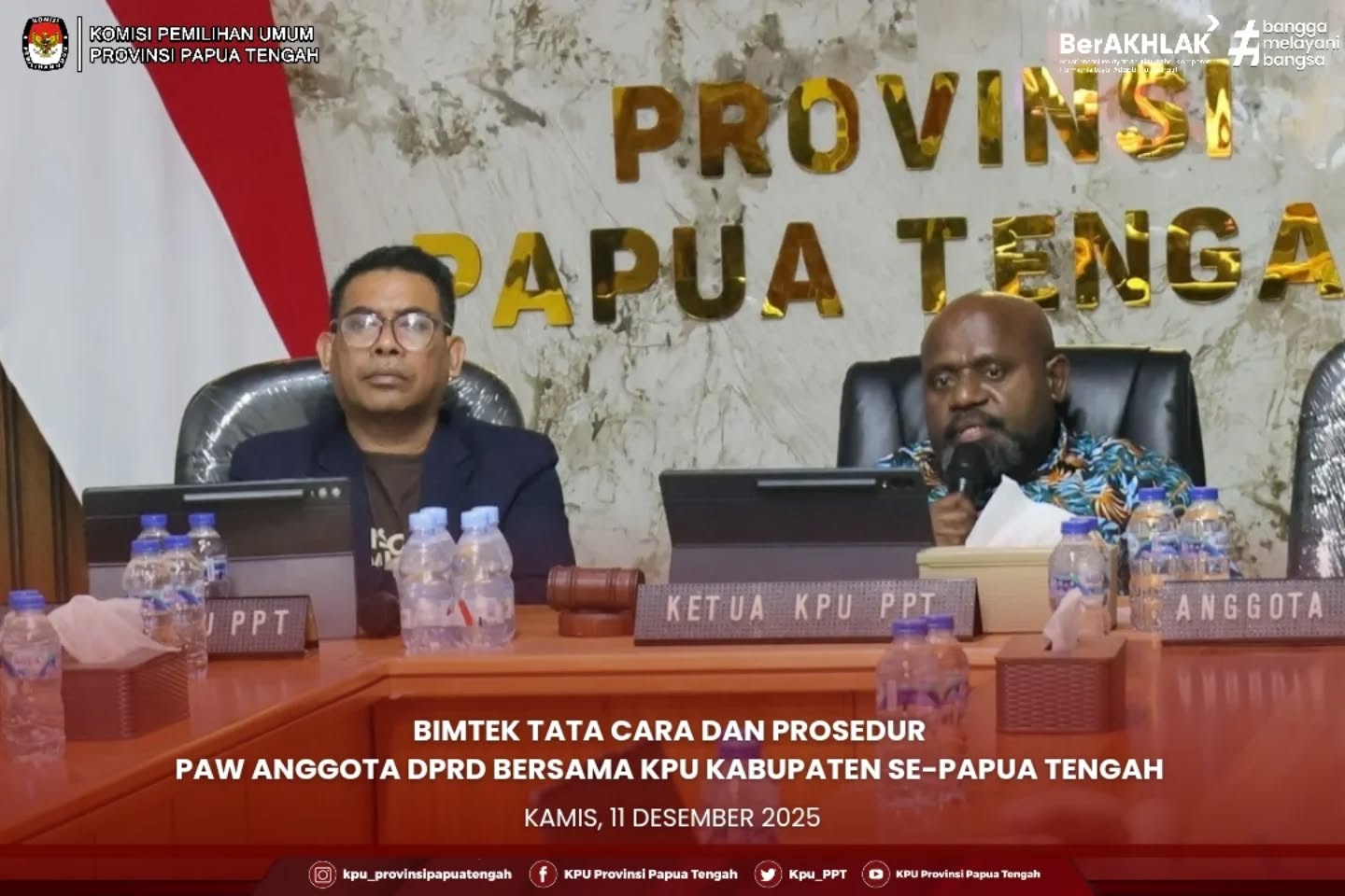 KPU Provinsi Papua Tengah melalui Divisi Teknis Penyelenggaraan Pemilu menyelenggarakan Bimbingan Teknis (Bimtek) Tata Cara dan Prosedur PAW Anggota DPRD bagi KPU Kabupaten se-Papua Tengah, pada hari Kamis (11/12/2025).